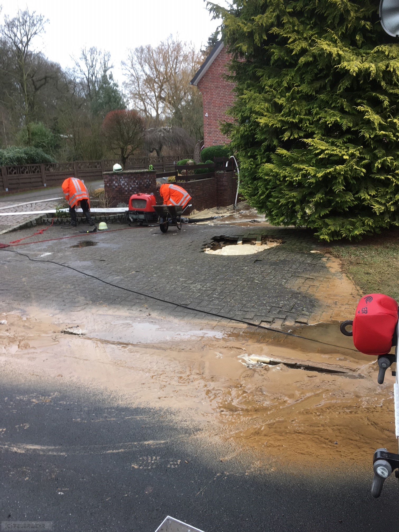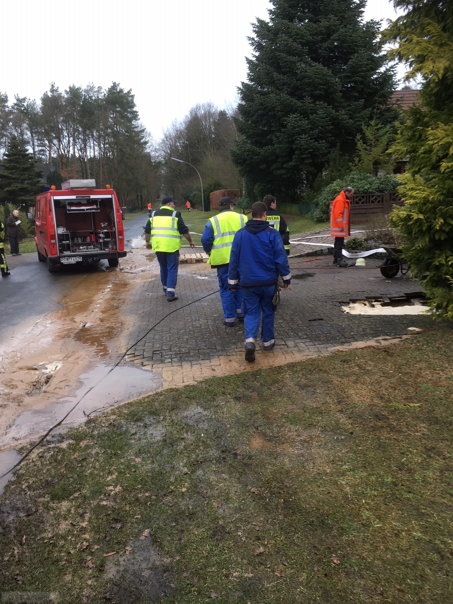 Badenstedt(tw) Alarm für die Ortsfeuerwehr Badenstedt sowie den Rüstwagen Zeven am 25.01 um 10:44 Uhr zu einem Wasserrohrbruch in Badenstedt, Heideweg. Bei Eintreffen des Rüstwagens sprudelte das Wasser aus der Plasterung der Garageneinfahrt. Umgehend wurden Sandsäcke befüllt, damit das Wasser nicht noch mehr Schaden anrichten kann. Die Ortsfeuerwehren aus Zeven und Badenstedt haben mittels Tragkraftspritze und Tauchpumpe das Wasser aus dem bereits voll gelaufenden Keller abgepumpt.