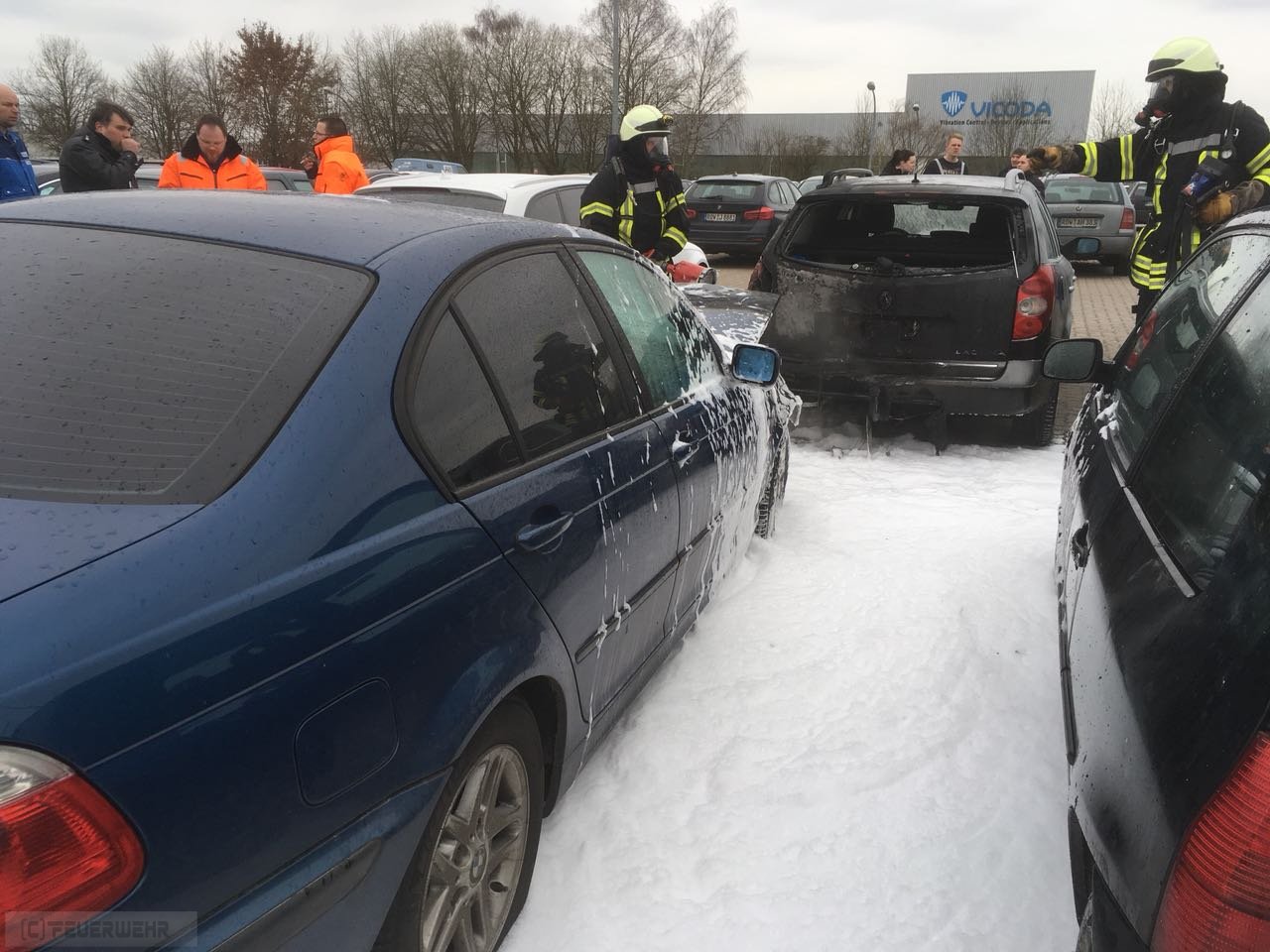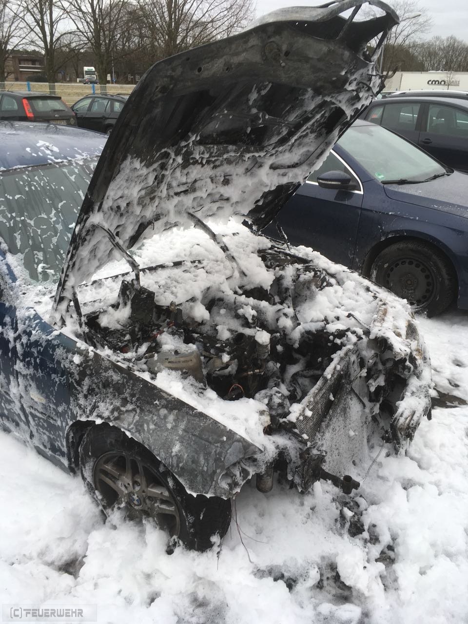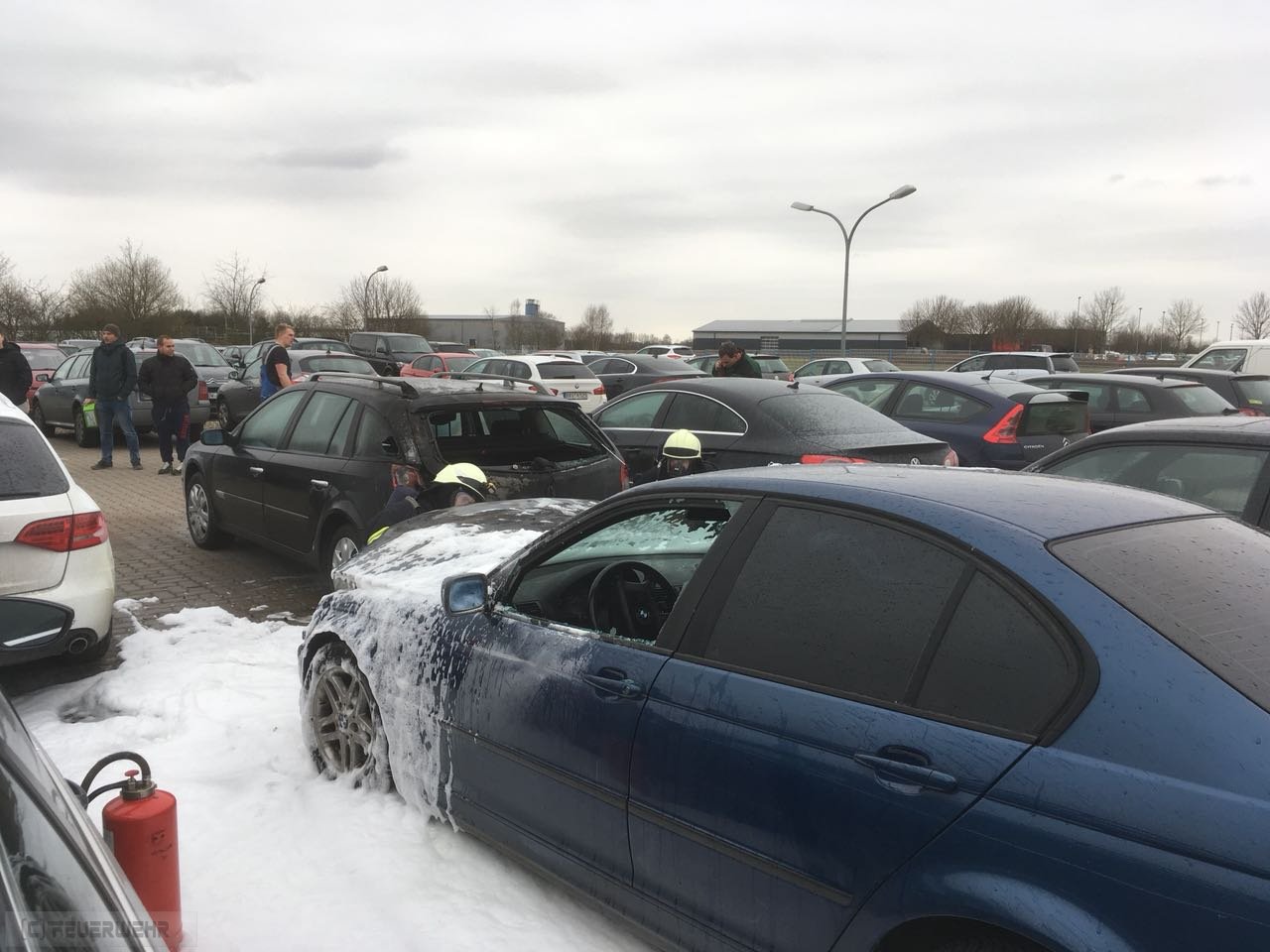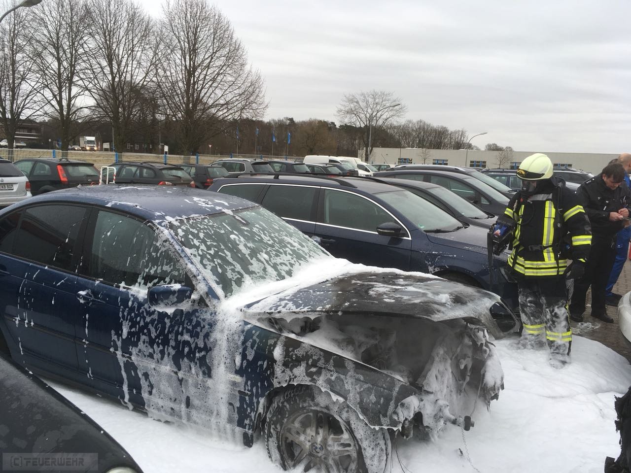 Zeven Aspe(tw) Auf Rückfahrt von Einsatz Nr. 28 kam über Funk die Meldung, dass auf einem Firmenparkplatz ein Fahrzeug brennen solle und das Fahrzeug bereits auf ein 2. Fahrzeug übergriffen hat. Bei Eintreffen des Löschgruppenfahrzeugs 20/16 hatten schon Polizeibeamte sowie Mitarbeiter erste Löschmaßnahmen mittels Feuerlöscher eingeleitet. Bei einem BMW kam es aus bisher ungeklärter Ursache zu einem Feuer im Motorraum, ein Trupp unter Atemschutz hat sofort die Brandbekämpfung eingeleitet und weitere Fahrzeuge geschützt. Mittels Löschschaum wurden letzten Flammen erstickt.